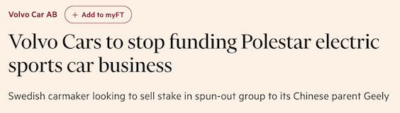Okay, so that’s BYD. We’ll look at 2 more Chinese EV manufacturers at the end of today’s newsletter. But let’s switch focus to a couple of Western car companies now. And first up, it’s the Swedish EV manufacturer - Polestar! Now, one of the main things to know about Polestar is that it was actually founded by 2 massive carmakers - Volvo Cars and Geely Holding.